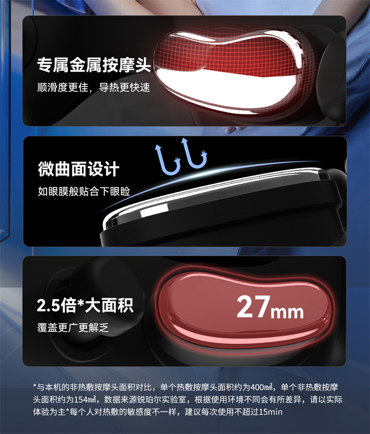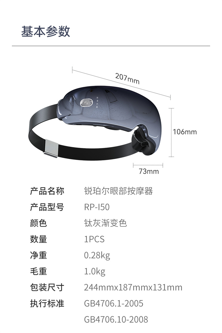 锐珀尔眼部按摩器RP-I50,根据国人眼型设计,机身弧度更贴合眼眶,贴心预留立体凹槽,保护眼球,按摩后视力不模糊,自带应急可视窗,可舒缓全黑密闭焦虑感;内置大自然的场景音效,让眼睛和心灵双重放松,还有蓝牙连接,可以随心听歌、听书等,更多神奇功能,等待您亲自试戴发现……