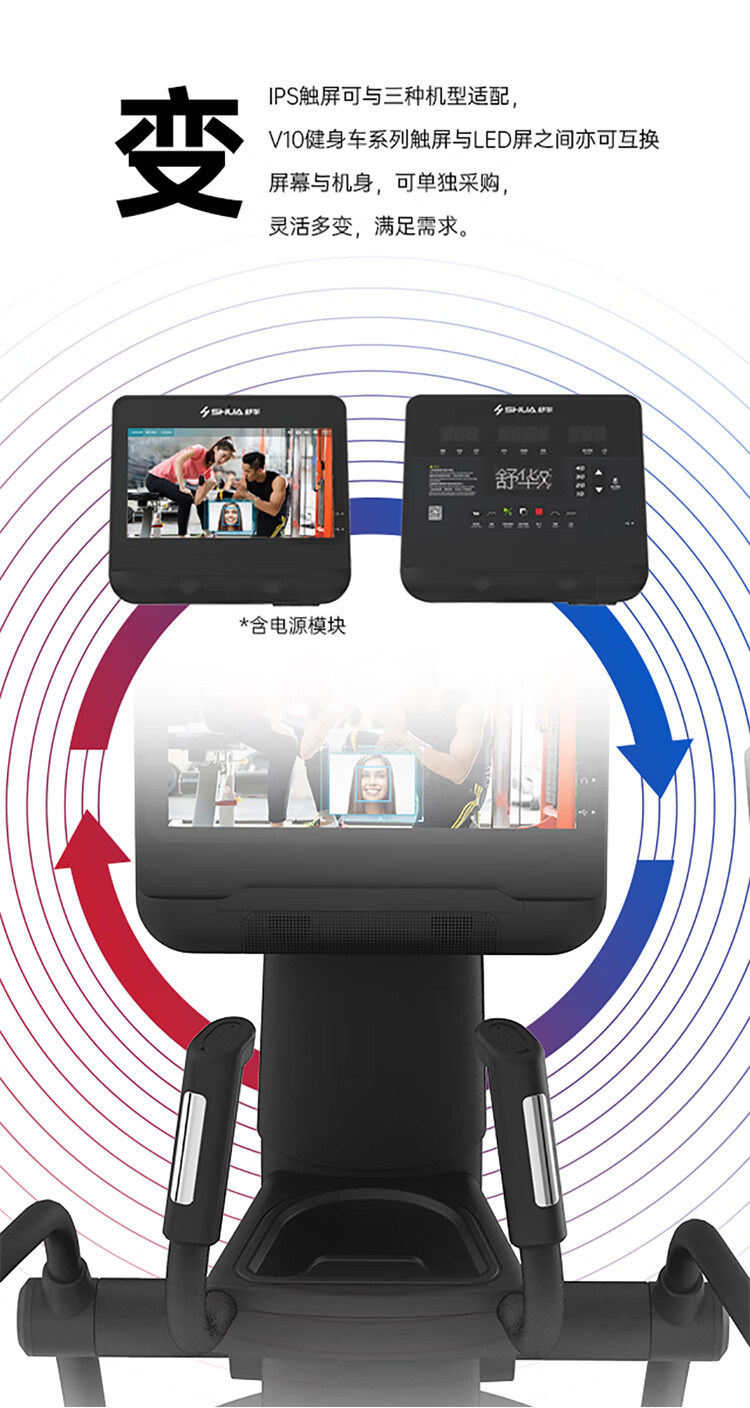舒华立式商用健身车SH-B9100U(V10)触屏版拥有超大显示和操作屏幕, 可以任意设置阻力、时间和距离等参数,还可以即时显示心跳和转速等数据,同时,SH-B9100U提供多项科学运动处方,更轻松掌握运动节奏。