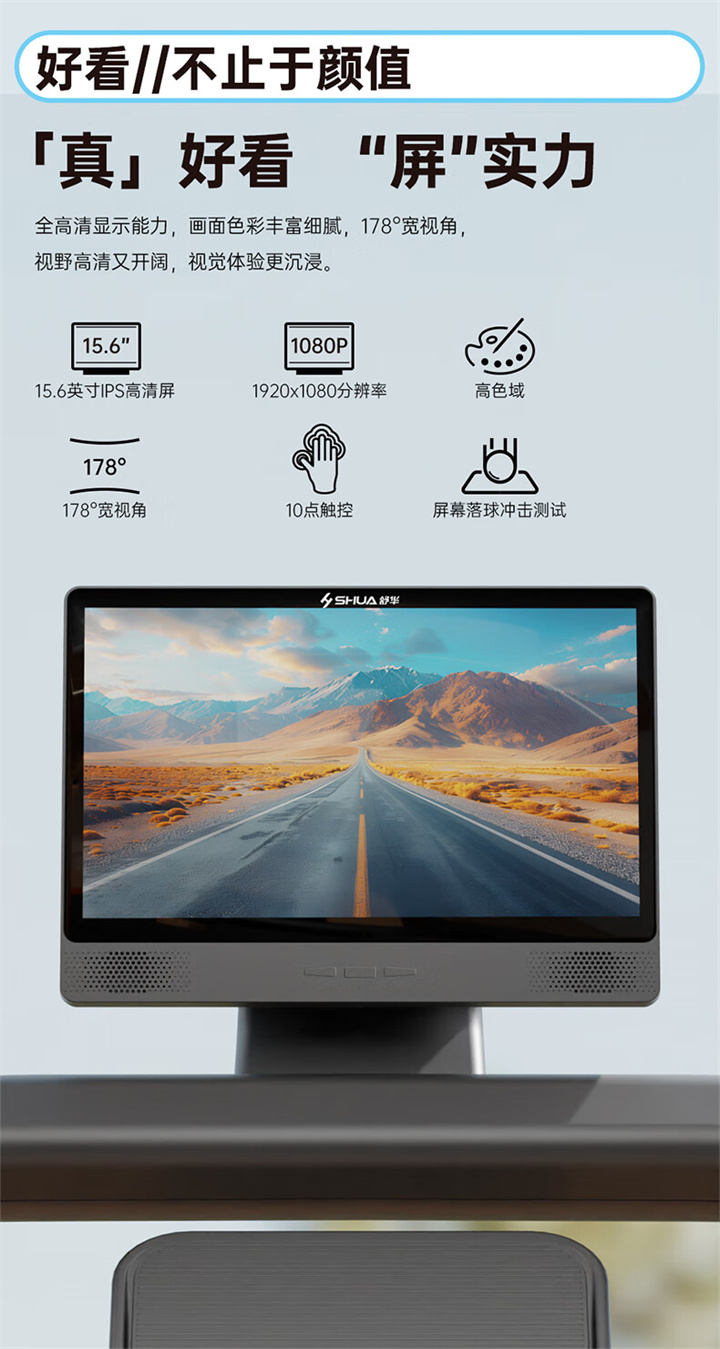 必一运动推荐健身器材-舒华商用电动跑步机SH-T6500拥有10.1寸IPS高清触摸屏、Z型动感时尚外观设计、70×150mm精钢立柱机身、F级高效静音马达、520mm商用豪华跑带和35mm双层全跑台减震跑板等优势,让您享受科学跑步。